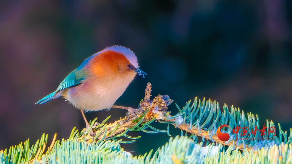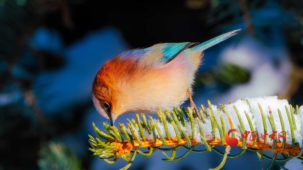 這群被譽(yù)為“祁連山精靈”的小鳥,頭頂雪白羽冠蓬松如絨,仿佛戴上了一頂天然的小絨帽,棕紅面頰溫潤(rùn)似玉,在陽光下泛著柔和的光澤,藍(lán)綠背羽如同上好的寶石,在雪色映襯下泛著金屬般的質(zhì)感。淡粉與橙白相間的腹羽柔和雅致,層次分明,在純白背景的映襯下,形成強(qiáng)烈而和諧的視覺碰撞,它們或亭亭立于覆雪松枝,或靈巧穿梭于松針間隙,更有靈動(dòng)的個(gè)體俯身探喙,啄取松針縫隙里的昆蟲,一聲輕脆的啄擊,劃破林間的清寂,卻更顯山野幽靜,羽翼輕振間,將“雪中覓食”的鮮活圖景永久定格。